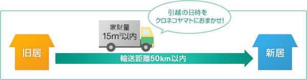 おまかせフリー割サービスとは、こちら側が指定した連続する5日間の中から、クロネコヤマト側が都合のよい日時を決めるというプランです。荷物の量は15㎥以内かつ、移動距離が50キロ以内の場合が対象となります。このプランを使うと、通常料金の半額相当の金額で引越しが可能です。