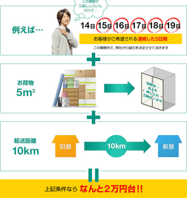 となります。この条件であれば半額以下の料金で引越しが出来ます。他の引越し業者の場合でも、同じ荷物の量であればトラック1台分は必要なので、安くても40,000円ほどはかかりますので、かなり安くなっていることが分かります。引越し業者にとって、日時を選べるのは作業効率を考えても非常に助かることなので、これだけ料金を安くしてくれるんです。