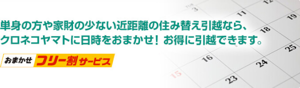 | おまかせフリー割サービス | クロネコヤマトに引越し日時を任せるプラン。輸送距離は50キロ圏内が目安。料金は通常の半額となります。 |