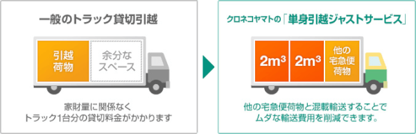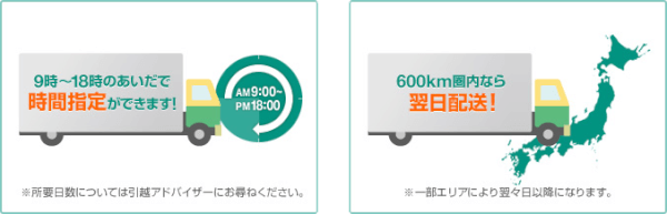 | 単身引越ジャストサービス | スピーディな配送とリーズナブルな料金設定を実現したプラン。時間指定、翌日発送がで可能です。 |