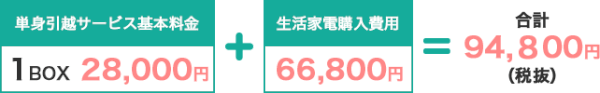 | 家具家電レンタル×単身引越 | 単身赴任などの、一定期間の一人暮らしにピッタリのプラン。新居で生活家電を買い揃えるよりもお得になります。 |