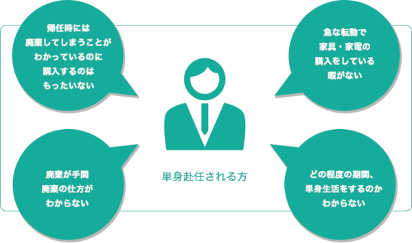 一定期間の単身赴任をする方には、「家具家電レンタル×単身引越サービス」というプランがおすすめです。通常の単身引越サービスに加えて、中古家具家電のレンタルサービスが付いたプランとなっており、新しく家具や家電を買い揃える必要がありません。