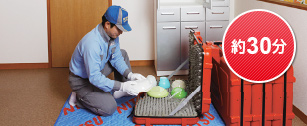 フルプランでは日通のスタッフが荷造りを行います。荷造りには、日通独自の反復素材を使用した梱包資材を利用します。これにより大幅な時間短縮が可能になります。