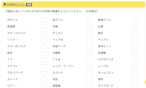 続いて、お荷物のリストについて入力します。リストにある家財の横に持っていく数を入力していきます。こちらの入力は任意なので、まだ分からない場合や詳しく決まっていない場合は、スルーしても大丈夫です。